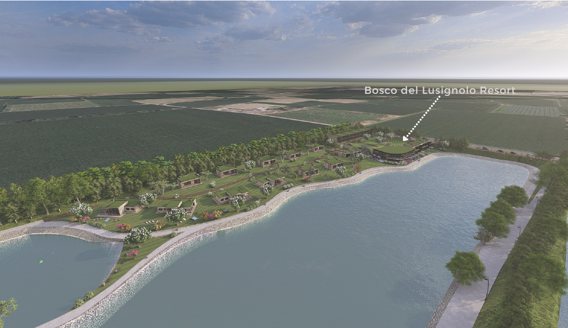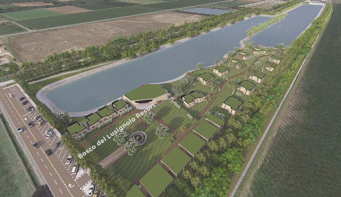 The Bosco del Lusignolo Resort Project foresees the development of an innovative tourist and hospitality complex set within a natural environment. The intervention is conceived with the aim of enhancing the existing landscape and promoting a sustainable, low environmental impact model of hospitality, strongly integrated with the surrounding forest and the adjacent artificial lake, which hosts sports and recreational activities, particularly water skiing.