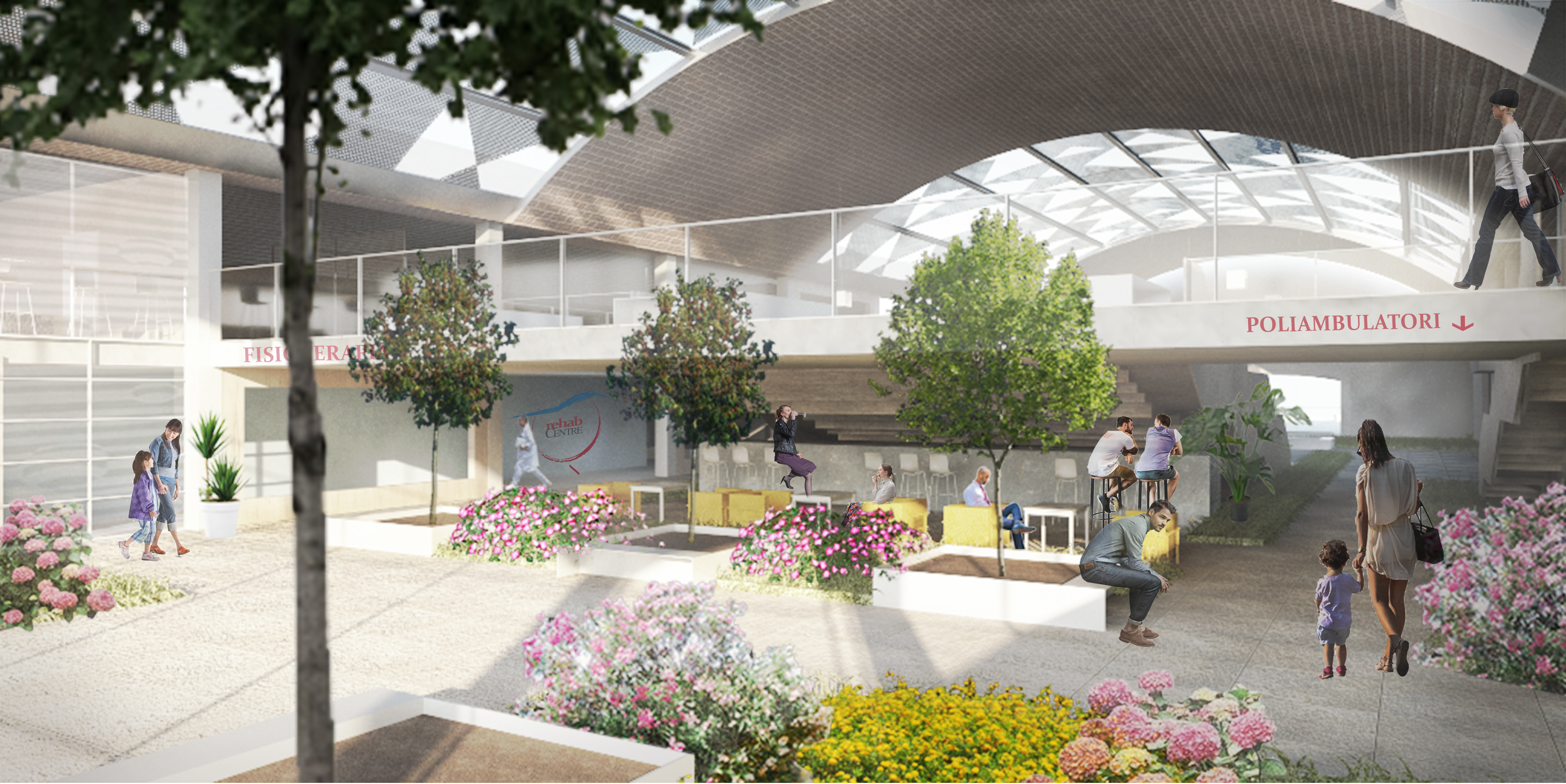 The ground floor will be the area dedicated to the center specialised in post-traumatic physiotherapy: inside, there will be ambulatories used by the diagnostic department, rehabilitation swimming pool and gym, and day hospital service. The center will have socializing spaces for daily living.