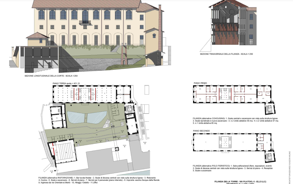 Restoration and conservation of the Filanda della Torre and consequent re-adaptation of the spaces. The project aims to recover the abandoned buildings and to restore the machinery installed in the spinning mill building (1500 m2) that will become a museum. The additional spaces available (1918 m2) could be used for co-working and/or accommodation activities with adjoining rooms/auditoriums (176 m2) and a Wellness Center (665 m2).