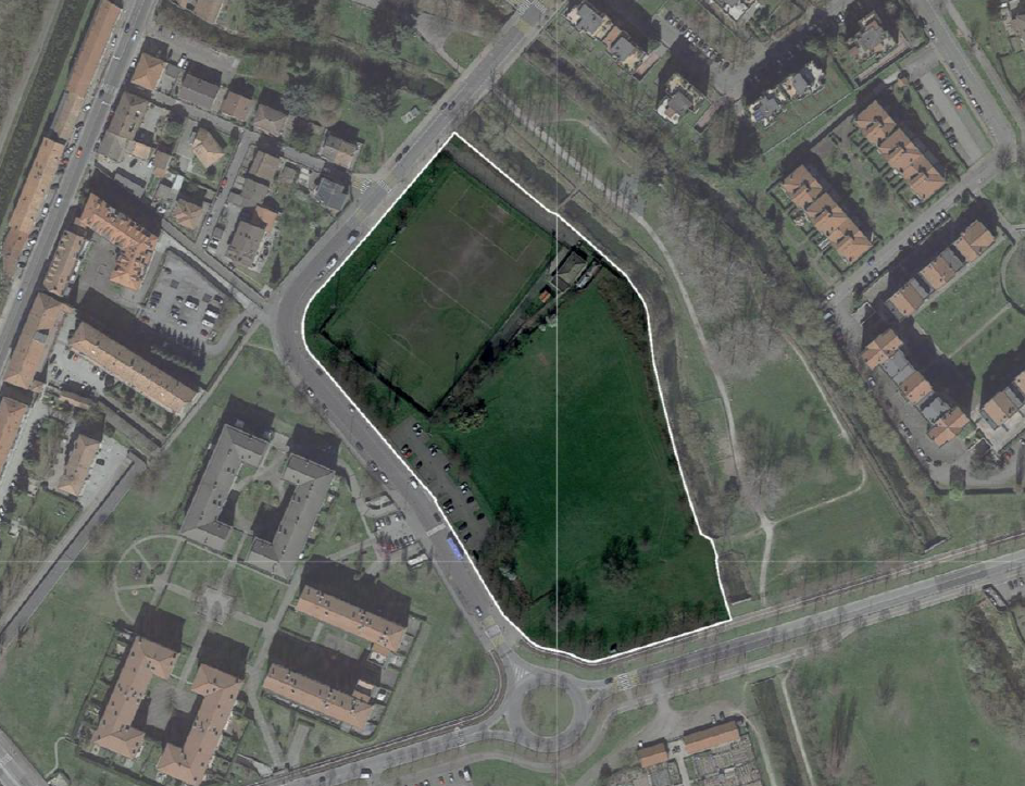 L'area è un Ambito di Trasformazione del Documento di Piano del PGT (2024), destinazione principale Residenziale e verde, superficie massima realizzabile 22.700 mq. Il principale obbiettivo dell’ambito di trasformazione, per la sua prossimità al Parco Agricolo sud Milano ed al parco delle Rogge, è quello di completare la Rete Ecologica Comunale sfruttando, gli elementi del paesaggio esistenti. Proprio per questo motivo dovranno essere rispettati gli indirizzi di tutela derivanti dal PTM metropolitano, attraverso la previsione all’interno dell’ambito di aree e interventi inseriti all’interno del più complesso sistema di previsioni di REC- rete Ecologica Comunale, con l’obiettivo di garantire la permeabilità e continuità del Parco delle Rogge e della valorizzazione degli elementi naturali presenti. In fase di progettazione si dovrà presentare particolare attenzione alla tutela degli elementi naturali presenti e si dovranno garantire adeguati interventi di integrazione e mitigazione, sia degli insediamenti che delle infrastrutture per la mobilità prevista, che trovano un modello di riferimento nei contenuti del “Repertorio delle misure di mitigazione e compensazione paesistico ambientali” e dell’”Abaco delle nature based solutions (NBS)”.
