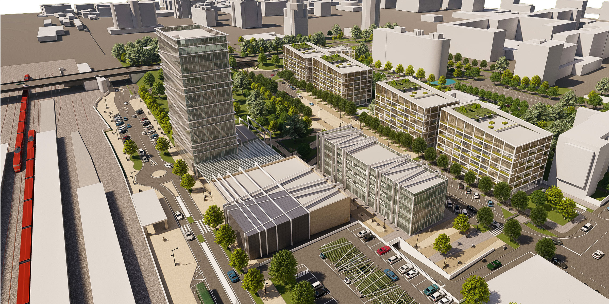 Il cuore del progetto è la nuova piazza centrale che sarà il fulcro di tutte le funzioni previste; costruita su diversi livelli, sarà adibita a funzioni private e pubbliche. Fuori dalla piazza, ci sarà un ampio spazio pubblico per un facile accesso ai cittadini, mentre a nord è prevista una grande zona riparata, in collegamento diretto con i binari della stazione.