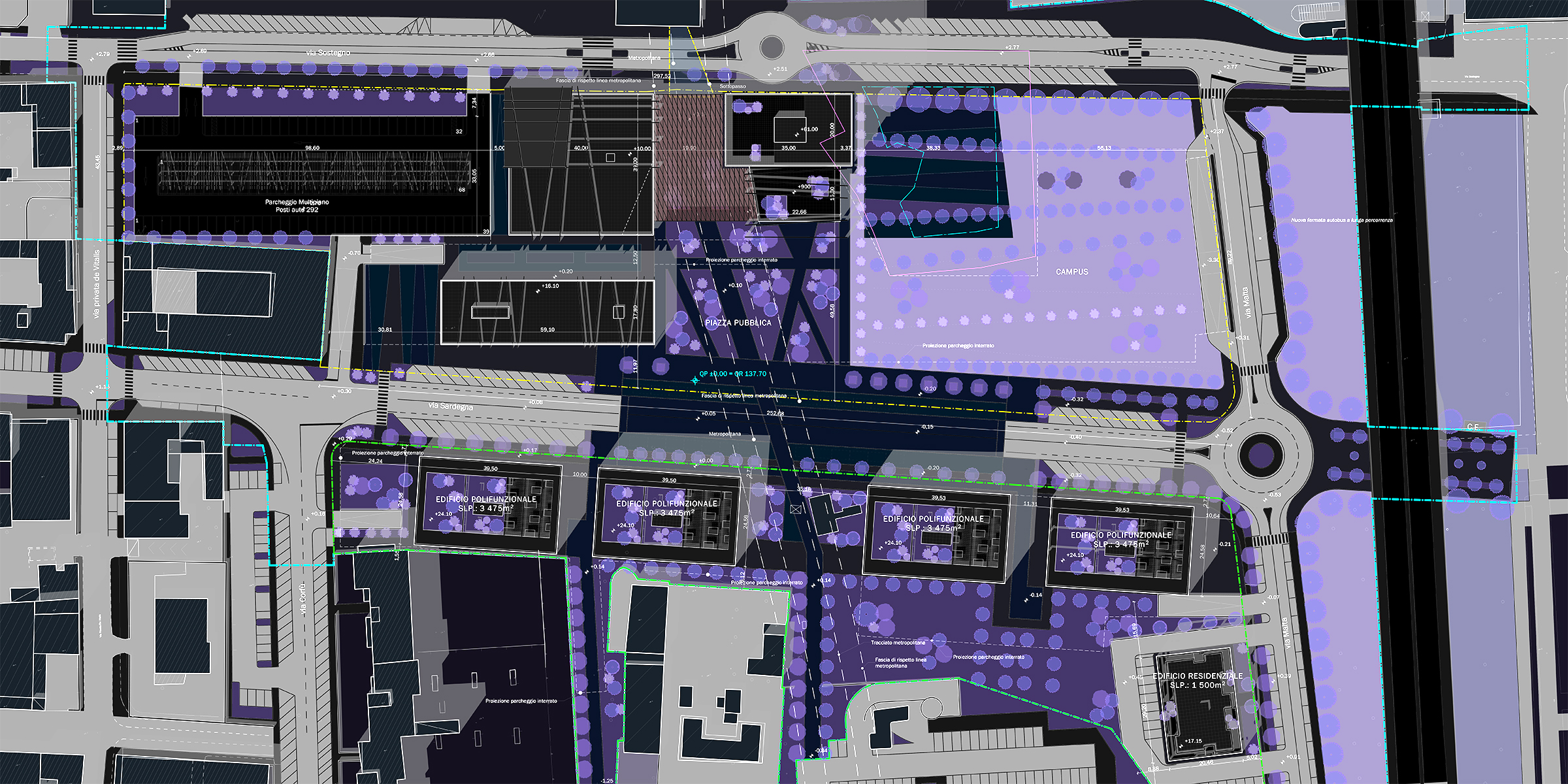 I due livelli nord-sud / Via Sardegna-Via Sostegno saranno collegati con rampe, scale mobili e ascensori panoramici. Il processo di studio e progettazione dei volumi da costruire è indirizzato verso un approccio innovativo e una soluzione coerente con il significato reale e simbolico dell'area di progetto.