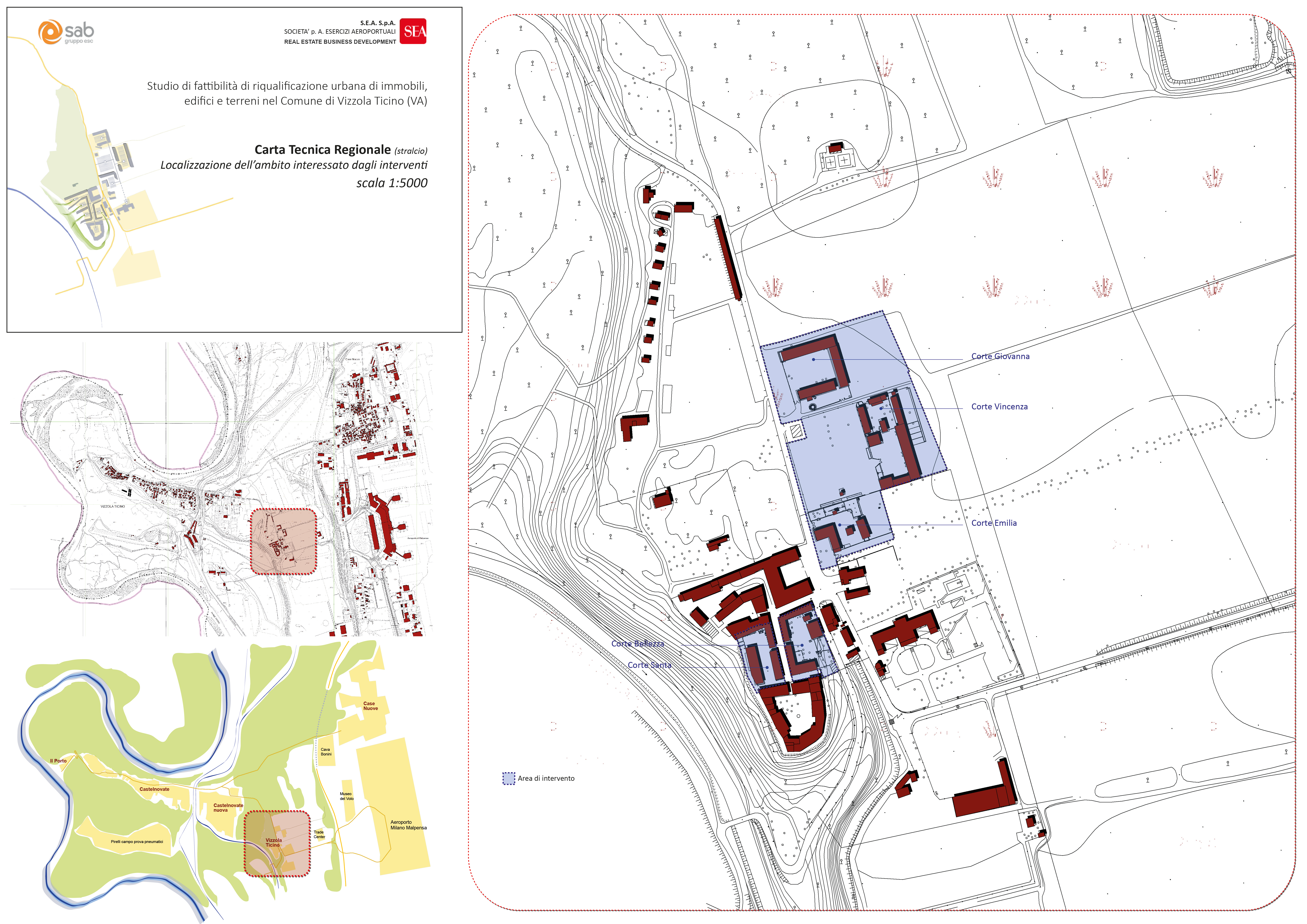 Progetto di riqualificazione di immobili, edifici e terreni costituenti parte del nucleo storico del Comune di Vizzola Ticino. Le proprietà si estendono su un’ampia superficie, comprendendo porzioni di tessuto edilizio all’interno del Borgo antico (Corte Bellezza e Corte Santa) e un’area più estesa, posta al di là della strada Comunale, costituita da tre edifici a corte (Corte Giovanna, Corte Vincenza e Corte Emilia) inseriti attorno ad un’area verde. Gli edifici, molto interessanti dal punto di vista architettonico per i caratteri tipologici e morfologici, ben si prestano per un recupero a nuovi usi, includendo eventualmente anche servizi di interesse pubblico.